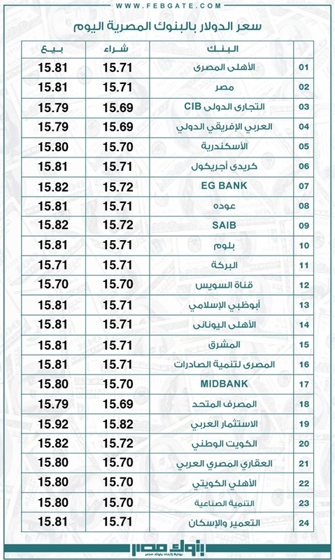 يذكر أن سعر صرف الدولار استقر في بداية تعاملات اليوم في 21 بنكًا، وسجل أعلى سعر في بنك الإستثمار العربي عند مستوى 15.82 جنيهًا للشراء، و15.92 جنيهًا للبيع، وسجل أقل سعر في بنوك التجاري الدولي – العربي الإفريقي – MIDBANK – المصرف المتحد – الكويت الوطني عند مستوى 15.70 جنيهًا للشراء، و15.80 جنيهًا للبيع.