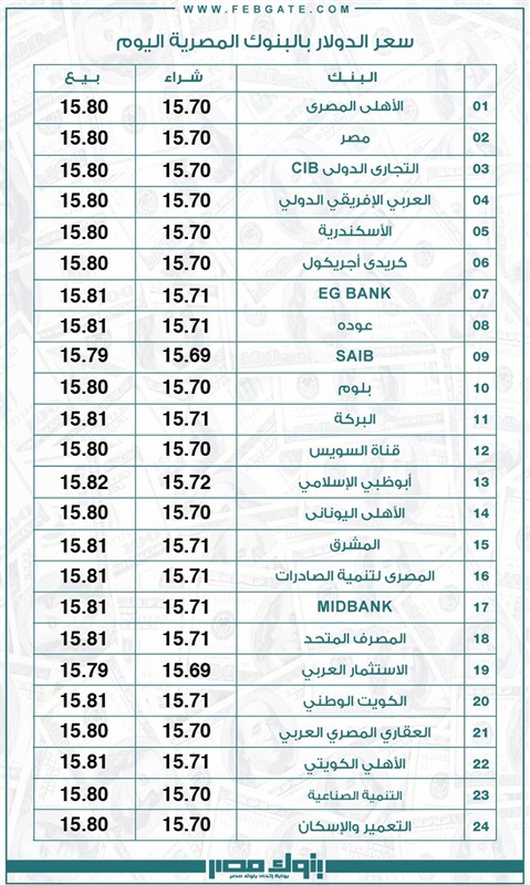 وفي مسح لـ”بنوك مصر” شمل 24 بنكًا عاملًا بالسوق المصرية، سجل أقل سعر لصرف الدولار في بنكي: (saib – الإستثمار العربي) عند مستوى 15.69 جنيهًا للشراء، و 15.79 جنيهًا للبيع.