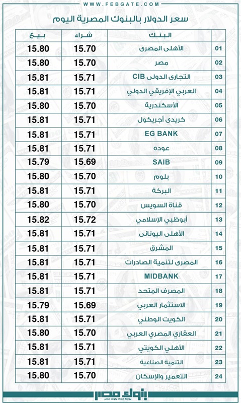 يذكر أن سعر صرف الدولار استقر في نهاية تعاملات أمس الأربعاء في 21 بنكًا، وسجل أعلى سعر في بنك أبوظبي الإسلامي عند مستوى 15.72 جنيهًا للشراء، و15.82 جنيهًا للبيع، وسجل أقل سعر في بنكي saib – الاستثمار العربي عند مستوى 15.69 جنيهًا للشراء، و15.79 جنيهًا للبيع.