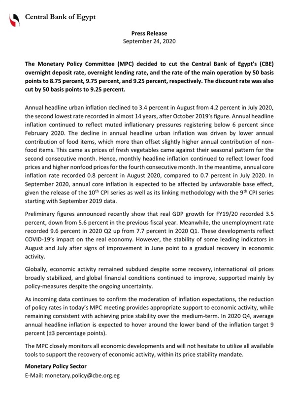 قررت لجنة السياسة النقديـة للبنك المركزي المصـري في اجتماعهـا اليـوم، الخميس، الموافـــق 24 سبتمبر 2020، خفض كل من سعر عائد الإيداع والإقراض لليلة واحدة وسعر العملية الرئيسية للبنك المركزي بواقع 50 نقطة أساس، ليصل الى 8.75٪ و9.75 ٪ و9.25٪ على الترتيب.