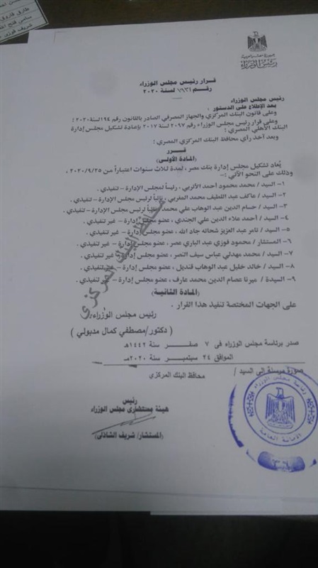 وذلك بعد الاطلاع على الدستور وقانون البنك المركزي والجهاز المصرفي الصادر بالقانون رقم 194 لسنة 2020، وعلی قرار رئيس مجلس الوزراء رقم 2097 لسنة 2017 بإعادة تشكيل مجلس إدارة البنك الأهلي المصري، وبعد أخذ رأي محافظ البنك المركزي المصري.
