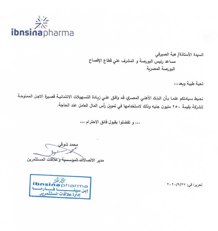وافق البنك الأهلى المصري، أكبر بنك حكومي، على توفير قرض بقيمة 250 مليون جنيه لصالح شركة ابن سينا فارما، وهي شركة متخصصة في مجال توزيع الأدوية.