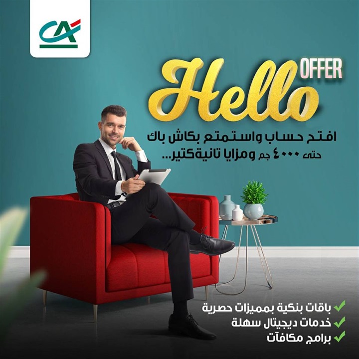 أعلن بنك كريدي أجريكول- مصر، عبر صفحته الرسمية على موقع التواصل الاجتماعي “فيس بوك”، عن أحدث عروضه “عرض HELLO”، والذي يتيح فرصة الحصول على كاش باك يصل إلى 4000 جنيه، وذلك عند فتح حساب من “كريدي أجريكول”، بالإضافة إلى باقات بنكية بمميزات حصرية، وخدمات ديجتال سهلة، وبرامج المكافأت.
