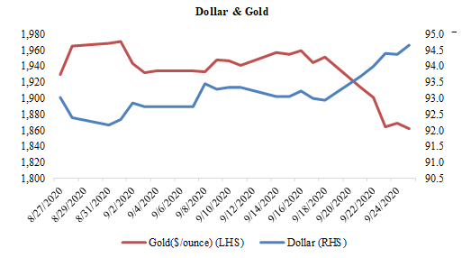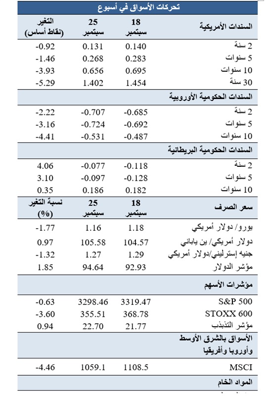سجلت سندات الخزانة الأمريكية ارتفاعًا خلال الأسبوع، مع تصاعد المخاوف بشأن حزمة التحفيز المالي الأمريكية حيث ينصب تركيز الكونجرس على استبدال قاضي المحكمة العليا وتراجع الاهتمام بحزمة التحفيز المالي. تفاقمت المخاوف متأثرة ببيانات سوق العمل الضعيفة وأعداد الإصابات بفيروس كورونا المتزايدة.