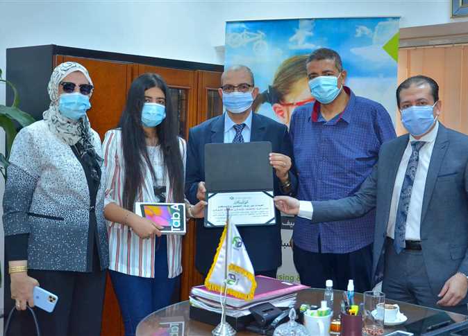 كرم أحمد أبو عوف، مدير بنك التعمير والإسكان فرع الغرفة التجارية، الطالبة آية عاطف عثمان، أولى الشهادة الإعدادية على مستوى المحافظة للعام الدراسي 2019 – 2020، بحضور أسرة الطالبة، والدكتور نبوي باهي، وكيل وزارة التربية والتعليم ببورسعيد.