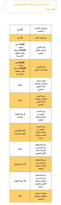 . يقدم البنك الأهلي المصري، مجموعة متنوعة من البطاقات الائتمانية بمزايا تناسب احتياجات كافة العملاء، وتتوافق مع إمكانياتهم، وتحقق لهم أكبر قدر من الرفاهية، من ضمنها بطاقة الخصم المباشر الكلاسيكية، والبلاتينية، والذهبية، وميزة، تعرف عليها من خلال التقرير التالي.
