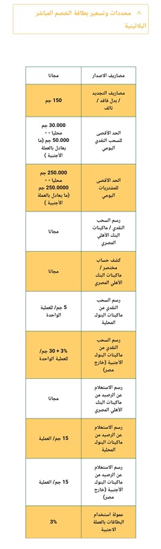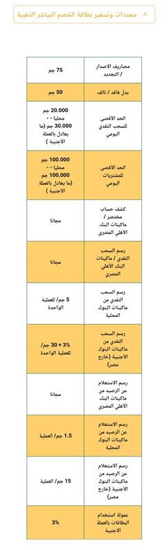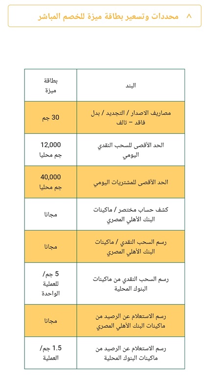 التمتع بميزة الإعفاء من رسوم السحب النقدي ورسوم الاستعلام عن أرصدة الحسابات عند التعامل بالبطاقة من خلال ماكينات الـ ATMs الخاصة بالبنك الأهلي المصري.
