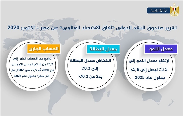 أعلنت وزارة المالية، عبر صفحتها على موقع التواصل الاجتماعي “فيس بوك”، أنه بمناسبة بدء اجتماعات الخريف، أصدر صندوق النقد الدولي تقريره حول “آفاق الاقتصاد العالمي”، برفع تقديراته لمعدل نمو الاقتصاد المصري فى العام المالي 2019 – 2020 إلى 3.5% بدلاً من 2% مع توقعات بوصول معدل النمو خلال عام 2025 إلى 5.6%، في ظل موجة من الانكماشات لأكبر اقتصادات العالم؛ بسبب تاثير استمرار تداعيات فيروس “كورونا” مع انخفاض معدل البطالة إلى 8.3%.