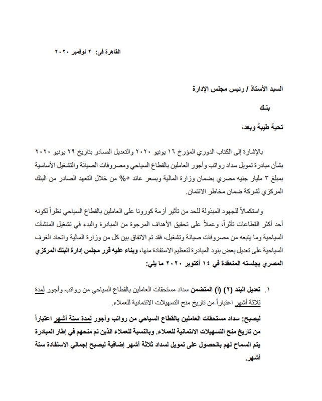 بالإشارة إلى الكتاب الدوري المؤرخ 16 يونيو 2020 والتعديل الصادر بتاريخ 29 يونيو 2020 بشأن مبادرة تمويل سداد رواتب وأجور العاملين بالقطاع السياحي ومصروفات الصيانة والتشغيل الأساسية بمبلغ 3 مليارات جنيه مصري بضمان وزارة المالية، وبسعر عائد 5% من خلال التعهد الصادر من البنك المركزي لشركة ضمان مخاطر الأئتمان.