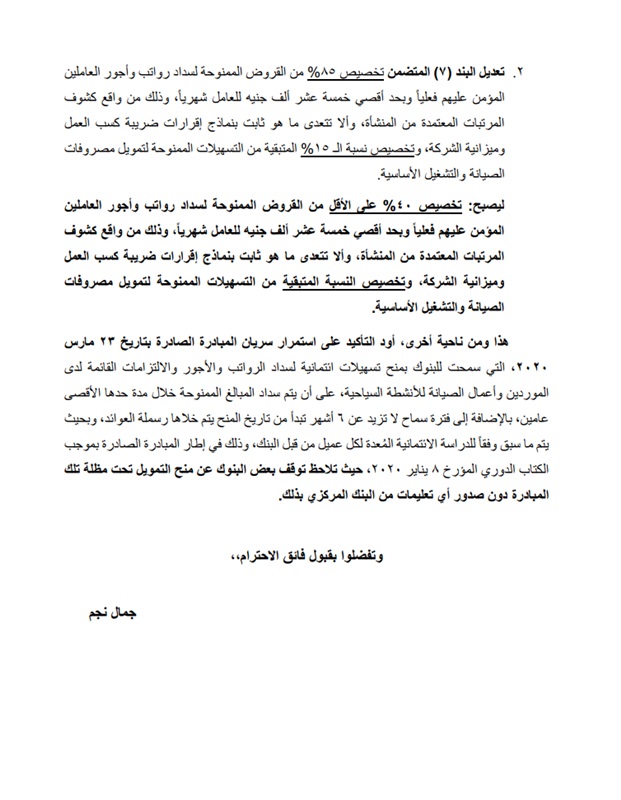 1. تعديل البند (2) (أ) المتضمن سداد مستحقات العاملين بالقطاع السياحي من رواتب وأجور لمدة ثلاثة أشهر من تاريخ منح التسهيلات الائتمانية للعملاء.