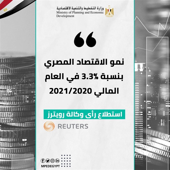 كما أشار تقرير وزارة التخطيط والتنمية الاقتصادية إلى استطلاع رأي وكالة رويترز الذي توقع نمو الاقتصاد المصري بنسبة 3.3% في العام المالي الجاري 2021/2020، وهو استطلاع رأي بين عدد من الاقتصاديين عن الاقتصاد المصري.