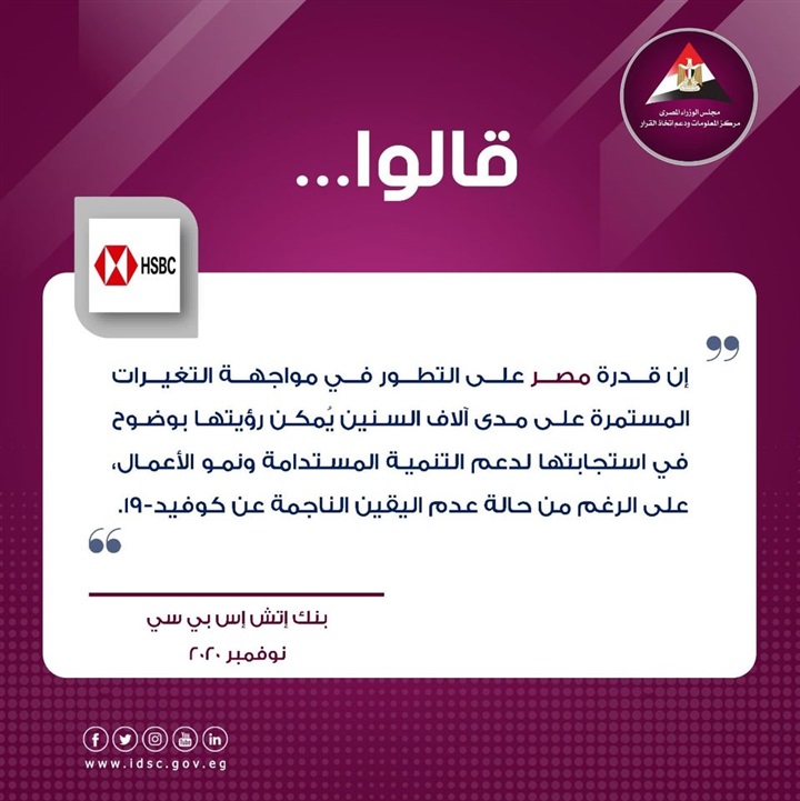نشر مركز المعلومات ودعم اتخاذ القرار التابع لمجلس الوزراء إنفوجرافًا، تقريرا صادرا عن بنك HSBC، أشار إلى قدرة مصر على مواجهة التغيرات الطارئة عليها، والتي انعكست بشكل كبير في دعمها لقضايا التنمية المستدامة، وذلك رغم الحالة العامة من عدم الاستقرار التي يشهدها العالم أجمع نتيجة تفشي فيروس كورونا، وما أحدثه من تأثيرات سلبية على مختلف الأنشطة والقطاعات.