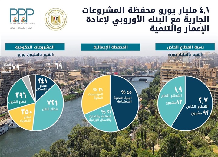 جدير بالذكر أن مصر تعد أكبر دولة عمليات للبنك الأوروبي لإعادة الإعمار والتنمية حاليًا حيث تبلغ إجمالي استثماراته نحو 6.8 مليار يورو في 123 مشروعًا، بينما تبلغ محفظة المشروعات الجارية نحو 4.6 مليار يورو تتوزع بواقع 2.7 مليار يورو للقطاع الخاص في 92 مشروعًا و1.9 مليار يورو للقطاع الحكومي في 13 مشروعًا.