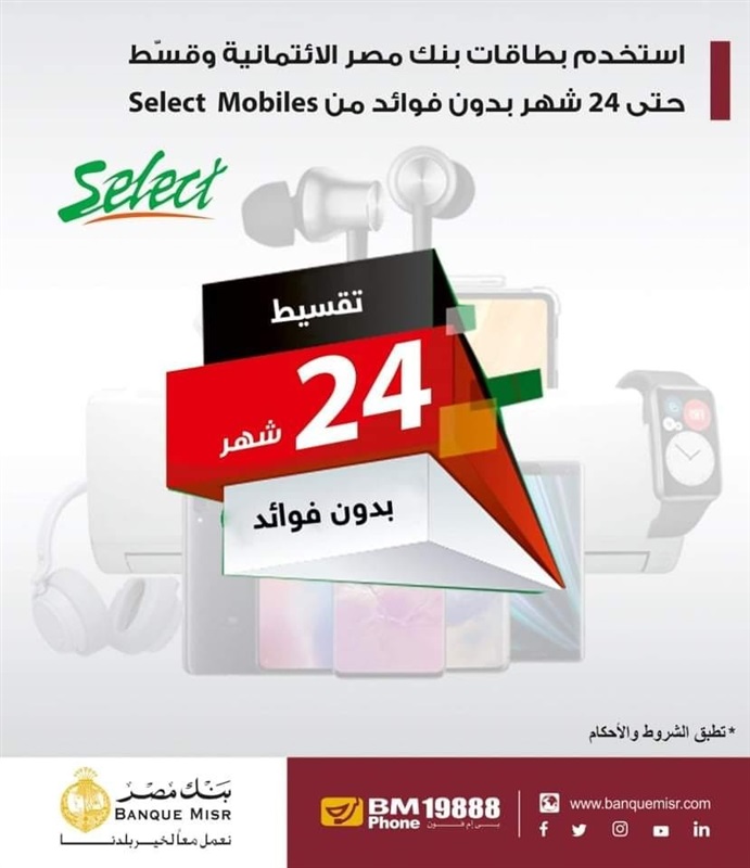 يُقدم بنك مصر لعملائه فرصة لتقسيط المشترياته حتى 24 شهرا دون فوائد من خلال متجر Select Mobiles، وذلك عند الشراء باستخدام بطاقات “مصر” الائتمانية.
