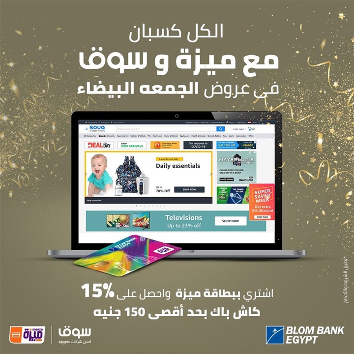 أعلن بنك بلوم- مصر، عبر صفحته الرسمية على موقع التواصل الاجتماعي “فيس بوك”، لعملائه عن فرصة الحصول على 15% كاش باك على المشتريات بحد أقصى 150 جنيها من “Souq.com”، وذلك من خلال الدفع ببطاقات ميزة بنك بلوم.