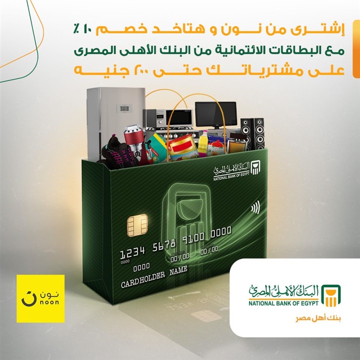 أعلن البنك الأهلي المصري، عبر صفحته الرسمية على موقع التواصل الاجتماعي “فيس بوك”، لعملائه حاملي بطاقات البنك الائتمانية، عن إمكانية الشراء من موقع نون، والحصول على خصم 10% على المشتريات حتى 200 جنيه.
