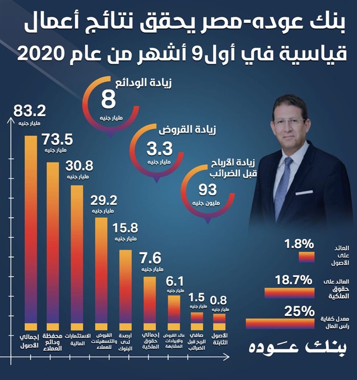 حقق بنك عوده- مصر، نتائج أعمال قياسية في أول 9 أشهر من عام 2020، حيث بلغت أرباح البنك قبل الضرائب 1.5 مليار جنيه، وتأتي التفاصيل كالآتي: