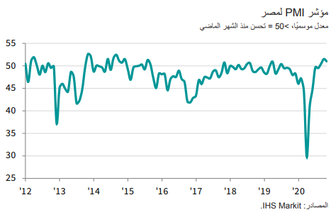 سجل مؤشر مديري المشتريات الرئيسي لمصر، التابع لمجموعة IHS Markit، خلال نوفمبر2020، أعلى المستوى المحايد 50 نقطة للشهر الثالث على التوالي.