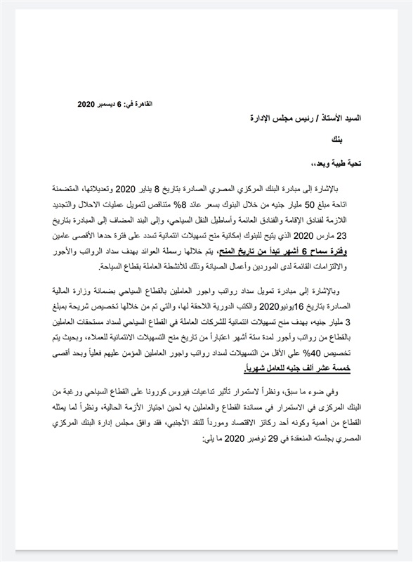 وأضاف: بالإشارة إلى مبادرة تمويل سداد رواتب وأجور العاملين بالقطاع السياحي بضمانة وزارة المالية الصادرة بتاريخ 61 يونيو 2020، والتي تم عن طريقها تخصيص شريحة بمبلغ 3 مليارات جنيه، بهدف منح تسهيلات ائتمانية للشركات العاملة في القطاع السياحي لسداد مستحقات العاملين 6 أشهر اعتبارًا من تاريخ منح التسهيلات للعملاء، إذ يتم تخصيص 40% على الأقل من التسهيلات لسداد رواتب وأجور العاملين المؤمن عليهم فعليًا بحد أقصى 15000 جنيه للعامل شهريًا.