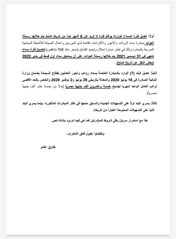 وأشار الى أنه تم تعديل البند (7) الوارد بالمبادرة الخاصة بسداد رواتب وأجور العاملين بقطاع السياحة بضمان وزارة المالية الصادرة في 16 يونيو 2020 والمعدلة بتاريخي 29 يونيو، و2 نوفمبر، والخاص بالحد الأقصى لراتب العامل الواحد شهريًا ليصبح 25 ألف جنيه بدلًا من 15 ألف جنيه.