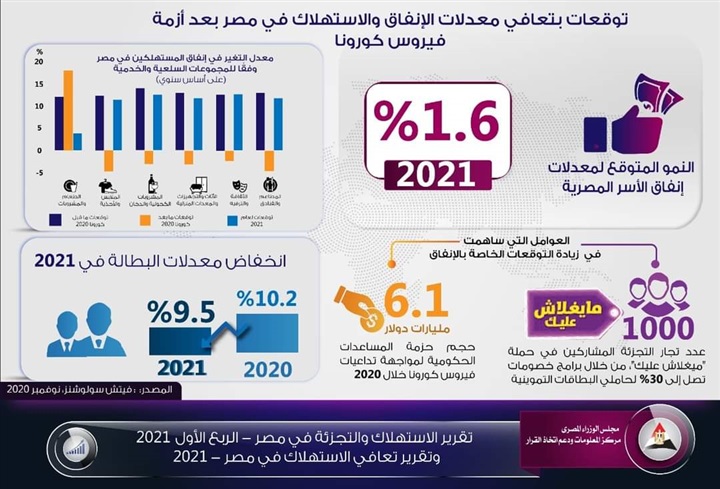 . نشر مركز معلومات مجلس الوزراء إنفوجراف، أوضح خلاله أن “فيتش” أصدرت تقريري: “الاستهلاك والتجزئة في مصر” و”تعافي الاستهلاك في مصر”، واللذان اشتملا على نقاط تخص معدلات استهلاك الأسر وإنفاقها، وتوقعات تعافيها خلال 2021 بعد انخفاض حدة تأثيرات فيروس كورونا المستجد.