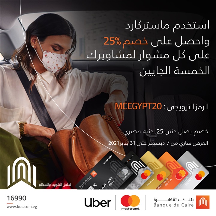 . أعلن بنك القاهرة، عبر صفحته الرسمية على موقع التواصل الاجتماعي “فيس بوك”، لعملائه عن إمكانية الحصول على خصم 25% بحد أقصى 25 جنيها، من تطبيق أوبر في “كل مشوار من الخمس مشاوير القادمين”، وذلك باستخدام بروموكود MCEGYPT20، وذلك عند استخدام بطاقات ماستركارد بنك القاهرة.