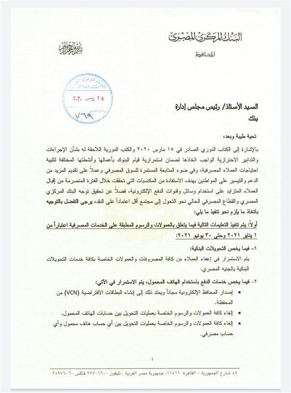 وتأتى هذة الخطوة من البنك المركزي؛ لدعم عملاء القطاع المصرفي في ظل ظروف جائحة كورونا التي تمر بها مصر خلال الفترة الحالية، وجاء النص كالتالي: