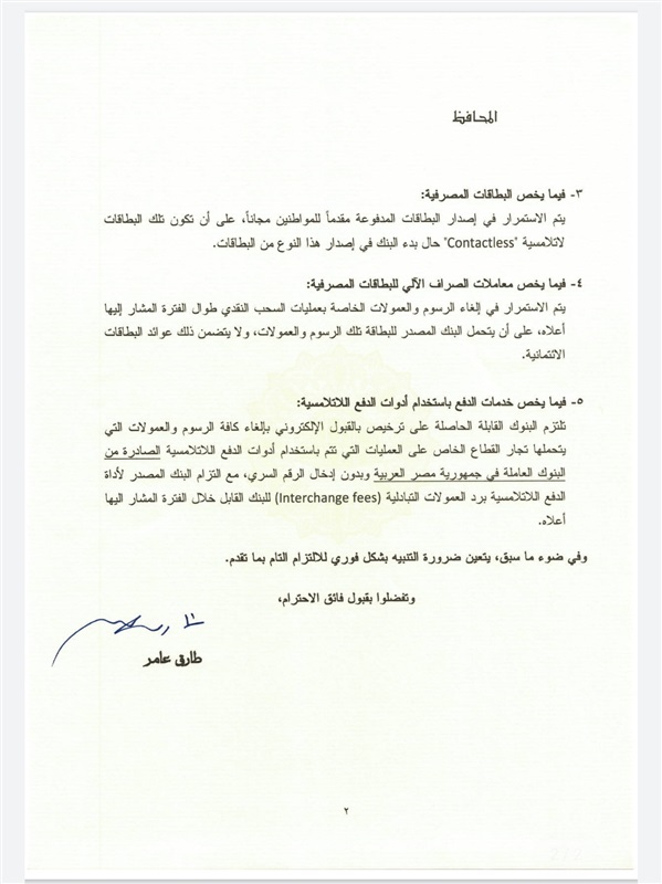تلتزم البنوك القابلة الحاصلة على ترخيص بالقبول الإلكتروني بإلغاء كافة الرسوم والعمولات التي يتحملها تجار القطاع الخاص على العمليات التي تتم باستخدام أدوات الدفع اللاتلامسية الصادرة من البنوك العاملة في جمهورية مصر العربية وبدون إدخال الرقم السري، مع التزام البنك المصدر لأداة الدفع اللاتلامسية برد العمولات التبادلية (Interchange fees) للبنك القابل خلال الفترة المشار إليها أعلاه.