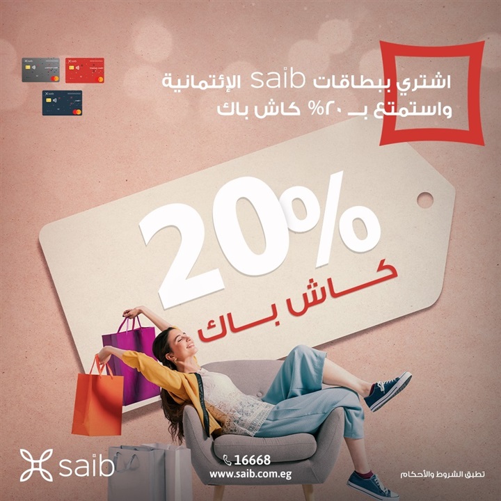 أعلن بنك الشركة المصرفية العربية saib، عبر صفحته الرسمية على موقع التواصل الاجتماعي “فيس بوك”، لعملائه عن إمكانية الحصول على 20% كاش باك عند التسوق ببطاقات البنك الائتمانية من المتاجر العالمية أو المحلية طوال شهر يناير 2021، وذلك بمناسبة العام الجديد 2021.