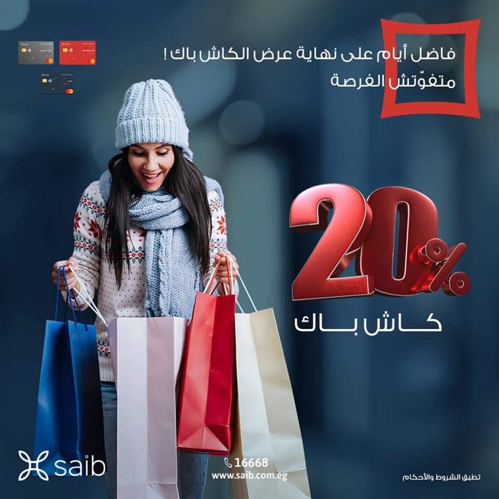 أعلن بنك الشركة المصرفية العربية saib، عبر صفحته الرسمية على موقع التواصل الاجتماعي “فيس بوك”، لعملائه عن إمكانية الحصول على كاش باك 20% من أي متاجر الملابس المحلية والدولية، وذلك عند استخدام بطاقات ائتمان البنك.