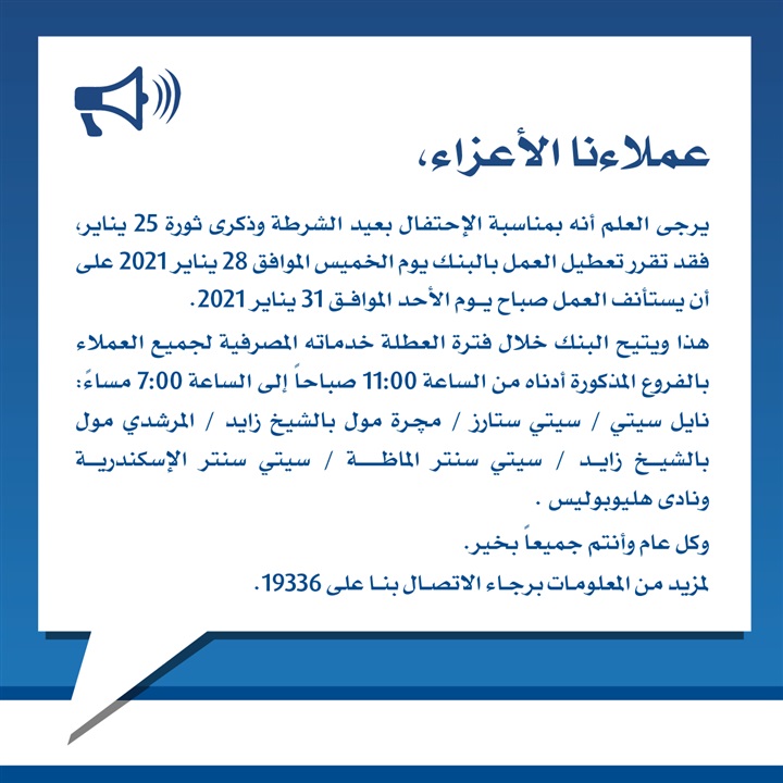 وأضاف البنك أنه سوف يتيح خلال فترة العطلة خدماته المصرفية لجميع العملاء من الساعة 11 صباحًا إلى 7 مساءً بفروع، نايل سيتي، سيتي ستارز، مجرة مول بالشيخ زايد، المرشدي مول بالشيخ زايد، سيتي سنتر ألماظه، سيتي سنتر الإسكندرية، نادي هليوبوليس.