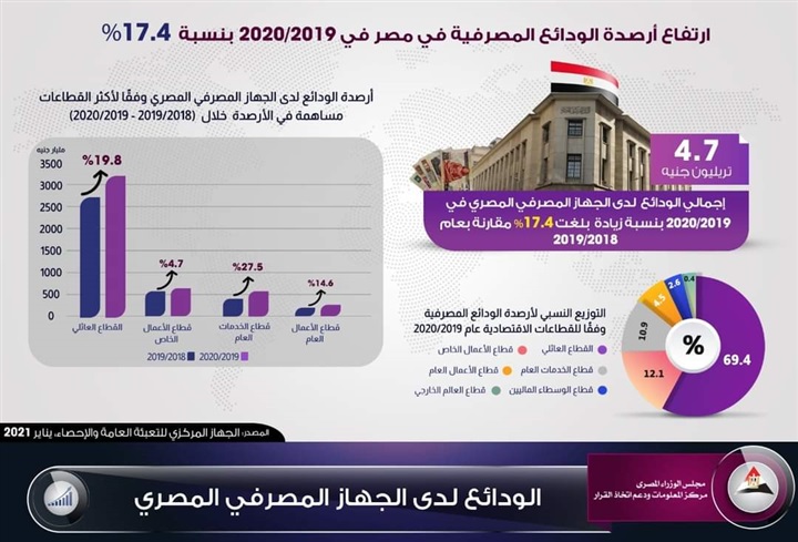 أصدر مركز المعلومات ودعم اتخاذ القرار بمجلس الوزراء، إنفوجرافا عن ارتفاع إجمالي الودائع في الجهاز المصرفي المصري إلى 4.7 تريليونات جنيه خلال 2019/ 2020 بنسبة قدرها 17.4% مقارنة بعام 2018/ 2019، ومن الجدير بالذكر أن نسبة مساهمة الودائع للقطاع العائلي تمثل 69.4% لإجمالي الودائع.