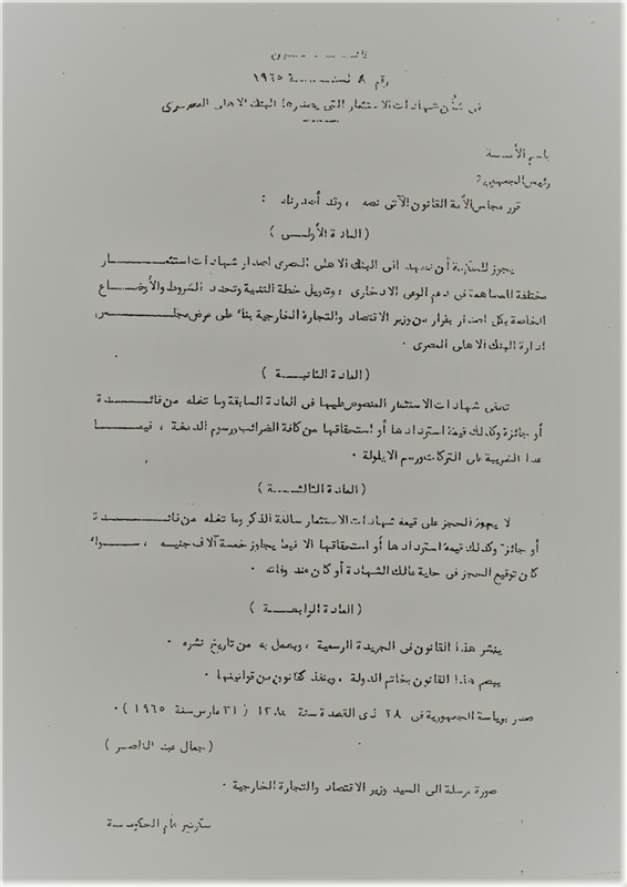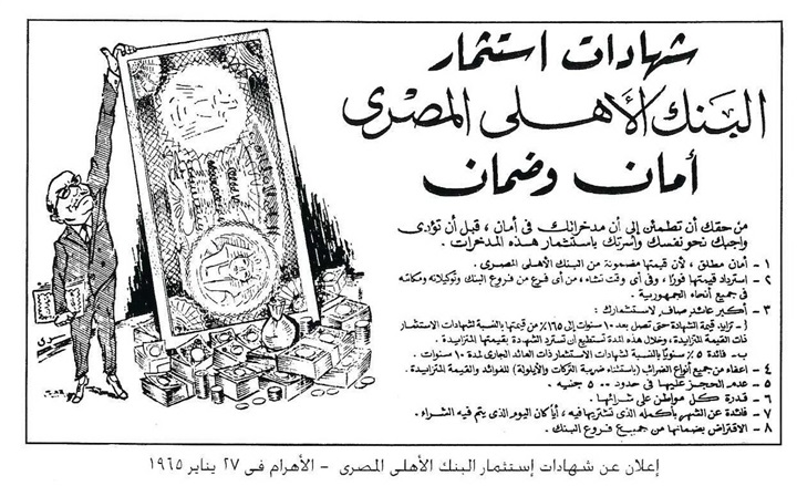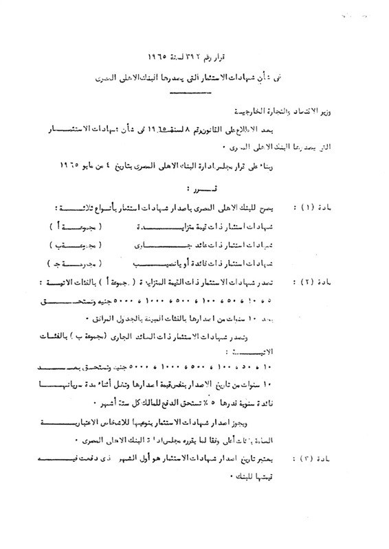 . شهد العقد السابع من القرن الماضي العديد من التحولات في القطاع المصرفي المصري، ففي 20 ديسمبر 1960، صدر قرار رئيس الجمهورية رقم 2337 لسنة 1960 والذي وضع النظام الأساسي للبنك الأهلي المصري باعتباره مؤسسة عامة ذات شخصية اعتبارية مستقلة تقوم بجميع الأعمال المصرفية، وقد انفرد البنك الأهلي المصري بتقديم العديد من الخدمات المصرفية الجديدة، ففي عام 1964، بدأ البنك الأهلي المصري في دراسة أنظمة شهادات الادخار والاستثمار، وفي يناير 1965 تم استحداث نظام شهادات الاستثمار لأول مرة في مصر، وبموجب قانون رقم (8) لسنة 1965 الصادر عن رئيس الجمهورية في 31 مارس 1965 ، عهد للبنك بإصدارها– نيابة عن وزارة المالية – للمساهمة في دعم الوعي الادخاري لدى المصريين، وتمويل خطة التنمية بشروط تحددها وزارة الاقتصاد والتجارة الخارجية بناءا على عرض مجلس إدارة البنك الأهلي المصري في حينها.