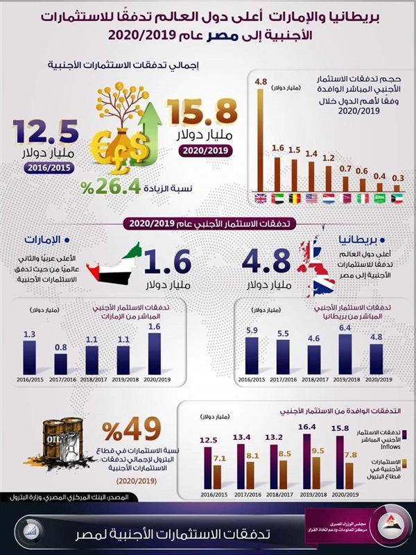 وأوضح أنه كان النصيب الأكبر من بريطانيا؛ والتي بلغ حجم التدفقات الواردة منها 4.8 مليارات دولار؛ لتصنف بذلك كأعلى دول العالم تدفقا للاستثمارات الأجنبية إلى مصر في 2020/2019، تلتها الإمارات في المركز الثاني عالميًّا، والأول عربيًّا بنحو 1.6 مليار دولار.