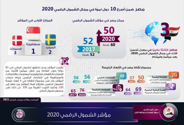 كما جاءت مصر في المركز 50 في 2020، مقارنةً بالمركز 52 في 2017، محققة مجموع نقاط بلغ 60 نقطة، أي بارتفاع 8 نقاط عن قيمة المؤشر في 2017؛ مما جعلها في المركز الثالث عالميًا في معدل تحسن الأداء في مجال الشمول الرقمي 2020، بعد ميانمار وفيتنام، فقد استطاعت مصر تحقيق تقدم في 3 أبعاد رئيسة للمؤشر، واستقرت في بُعد واحد.
