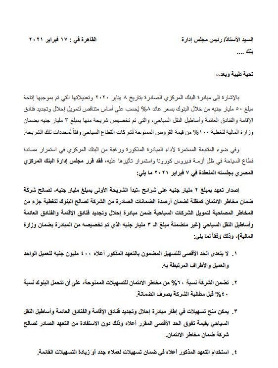 بالإشارة إلى مبادرة البنك المركزي الصادرة بتاريخ 8 يناير 2020، وتعديلاتها التي تم بموجبها إتاحة مبلغ 50 مليار جنيه من خلال البنوك بسعر عائد 8% يُحسب على أساس متناقص التمويل إحلال وتجديد فنادق الإقامة والفنادق العائمة وأساطيل النقل السياحي، والتي تم تخصيص شريحة منها بمبلغ 3 مليارات جنيه بضمان وزارة المالية لتغطية 100% من قيمة القروض الممنوحة لشركات القطاع السياحي وفقا لمحددات تلك الشريحة.