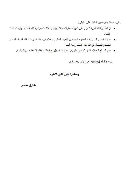 أن المبادرة المذكورة تسري على تمويل عمليات إحلال وتجديد منشآت سياحية قائمة بالفعل وليست تحت الإنشاء.