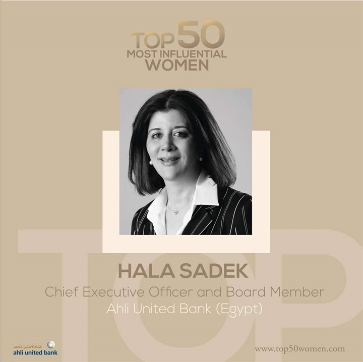 هالة حاتم صادق، الرئيس التنفيذي وعضو مجلس إدارة البنك الأهلي المتحد- مصر، حيث تتمتع بخبرة تمتد إلى ثلاثين عاماً في القطاع المصرفي التجاري. فقد شغلت منصب نائب أول رئيس تنفيذى للمخاطر والشئون المالية والعمليات بالبنك الأهلى المتحد- مصر، ورئيس مجموعة إدارة مخاطر الائتمان والاستثمار البنك التجاري الدولي.