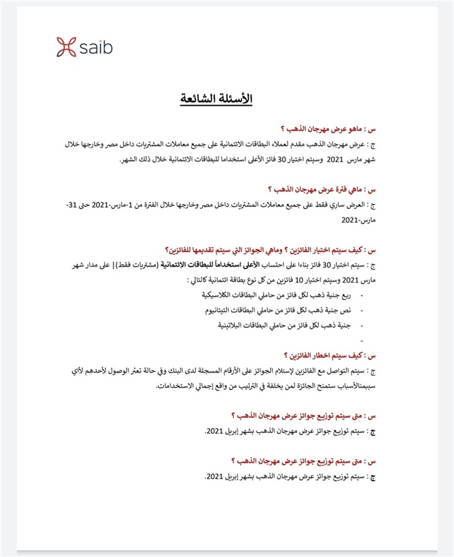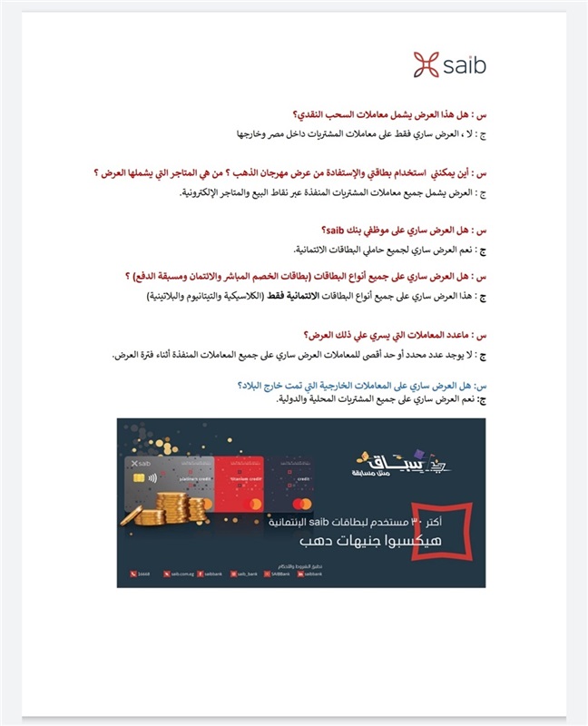 جدير بالذكر أن بطاقات saib الائتمانية توفر العديد من المزايا والعروض الحصرية للعملاء والتي تتضمن برنامج المكافآت pay with rewards بالتعاون مع شركة ماستر كارد.