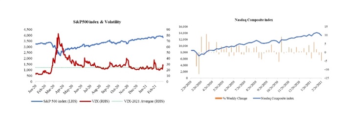 انخفضت الأسهم الأمريكية هذا الأسبوع أثر ارتفاع عوائد سندات الخزانة امما أدي الي إثارة شكوك المستثمرين حول التقييمات المبالغ فيها لأسهم قطاع التكنولوجيا، حيث تراجع مؤشر ناسداك المركب Nasdaq لأكبر الأسهم التكنولوجية بنسبة 4.92%، في أسوأ خسارة أسبوعية له منذ أكتوبر 2020. بالإضافة إلى ذلك، فإن ارتفاع العائدات أثرت سلبًا على شهية المستثمرين تجاه الأصول ذات المخاطر بشكل عام، حيث انخفض مؤشري ستاندرد أند بورز 500S&P و داو جونز الصناعي Dow Jones بنسبة 2.45% و1.78% على التوالي.