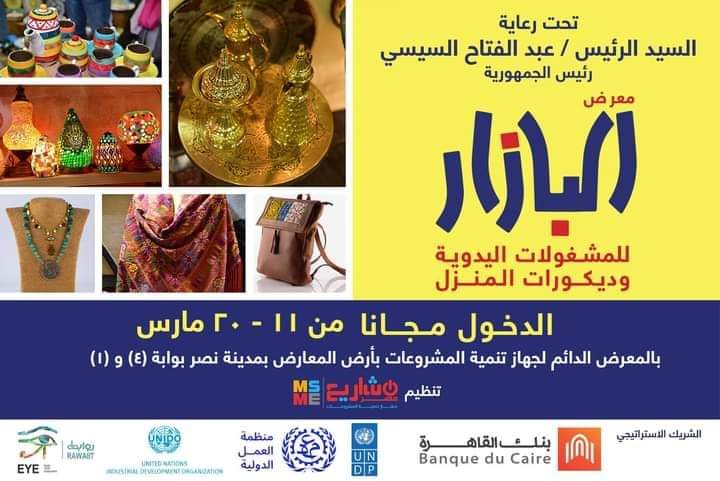 . تحت رعاية السيد الرئيس عبد الفتاح السيسى رئيس الجمهورية، ينظم جهاز تنمية المشروعات المتوسطة والصغيرة ومتناهية الصغر معرض “البازار” للمشغولات اليدوية وديكورات المنزل، فى الفترة من 11 مارس إلى 20 مارس، بالمعرض الدائم لجهاز تنمية المشروعات بأرض المعارض بمدينة نصر.