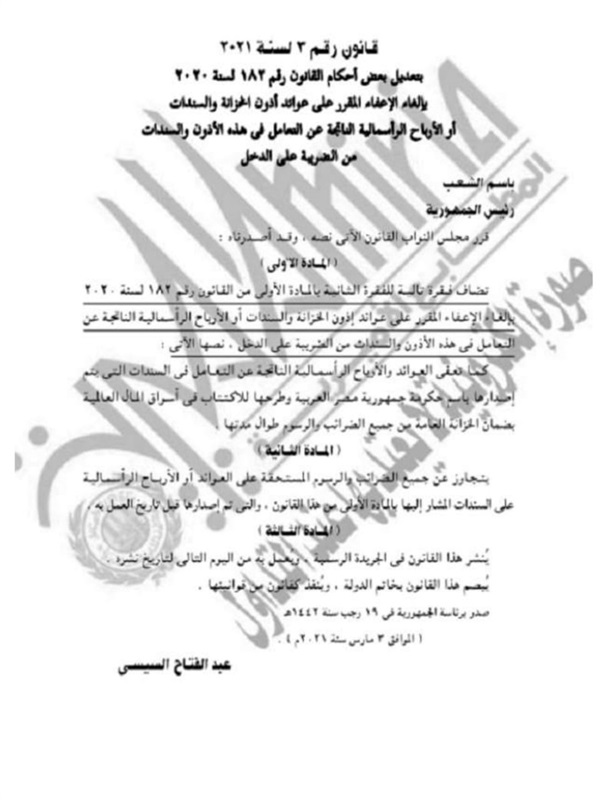 الاخبار الرئيس يصدق على تعديل بعض أحكام القانون الخاص بضريبة أرباح أذون الخزانة والسندات بواسطة بنوك مصر 6 مارس، 2021 كتب بنوك مصر 6 مارس، 2021 النشر 0FacebookTwitterPinterestLinkedinWhatsappTelegramCopy LinkEmail 334FacebookTwitterPinterestLinkedinWhatsappTelegramCopy LinkEmail .أصدر الرئيس عبدالفتاح السيسي، القرار رقم 3 لسنة 2021، بتعديل بعض أحكام القانون رقم 182 لسنة 2020، بشأن إلغاء الإعفاء المقرر على عوائد أذون الخزانة والسندات أو الأرباح الراسمالية الناتجة عن التعامل في هذه الأذون والسندات من الضريبة على الدخل. النشر 0 FacebookTwitterPinterestLinkedinWhatsappTelegramCopy LinkEmail البورصة تخسر 19.5 مليار جنيه في أسبوع محمد عبد العال يكشف تأثير إعفاء عوائد أذون الخزانة من ضريبة الدخل على الدين العام