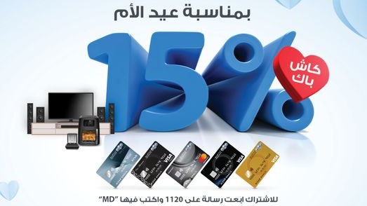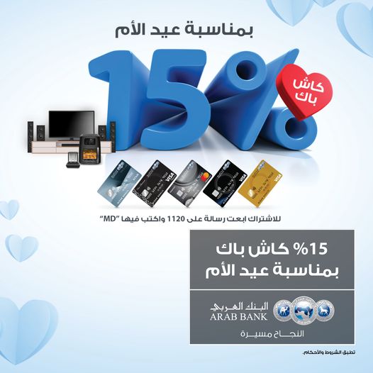 أعلن البنك العربي، عبر صفحته الرسمية على موقع التواصل الاجتماعي “فيس بوك”، لعملائه عن إمكانية الحصول على كاش باك 15% على جميع مشترياتك من متاجر (الإلكترونيات، المجوهرات، الأجهزة المنزلية)، وذلك عند الدفع ببطاقات البنك العربي الائتمانية.