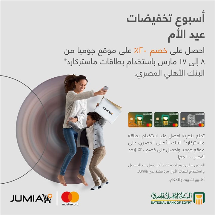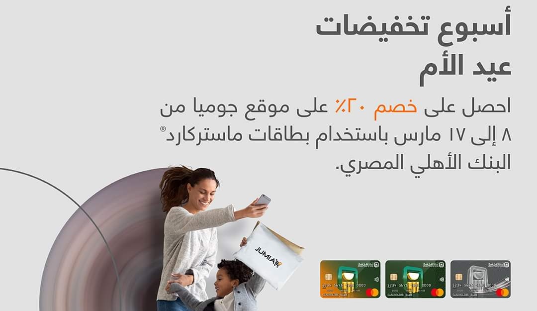 بمناسبة عيد الأم، أعلن البنك الأهلي المصري، عبر صفحته الرسمية على موقع التواصل الاجتماعي “فيس بوك”، لعملائه عن فرصة الحصول على خصم 20% من موقع “جوميا-Jumia”، بحد أقصى 100 جنيه على المشتريات، وذلك عند استخدام بطاقات ماستركارد البنك الأهلي المصري.