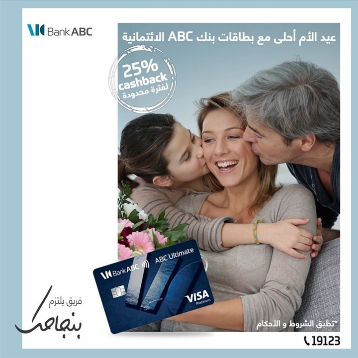. يقدم بنك ABC، لعملائه فرصة للحصول على 25% كاش باك على مشترياتهم، حتى نهاية شهر مارس الجاري، وذلك عن طريق الدفع ببطاقات البنك الائتمانية، وذلك بمناسبة عيد الأم.