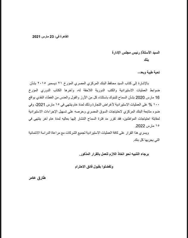 قرر البنك المركزي المصري، اليوم، الثلاثاء، عبر موقعه الإلكتروني الرسمي، بتمديد فترة السماح للبنوك باستثناء الأرز والفول والعدس من الغطاء النقدي بواقع 100% على العمليات الاستيرادية لأغراض التجارية لمدة عام تنتهي في 15 مارس 2022.