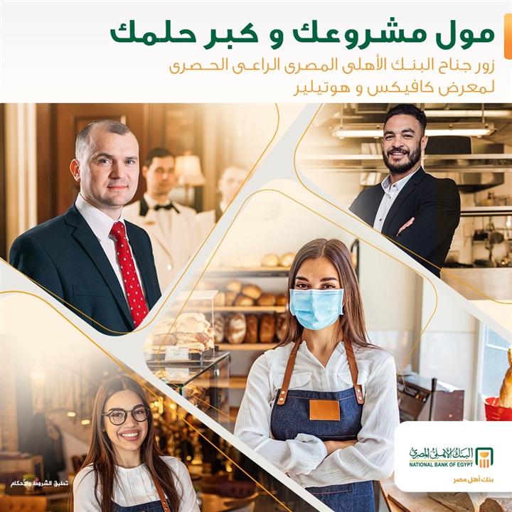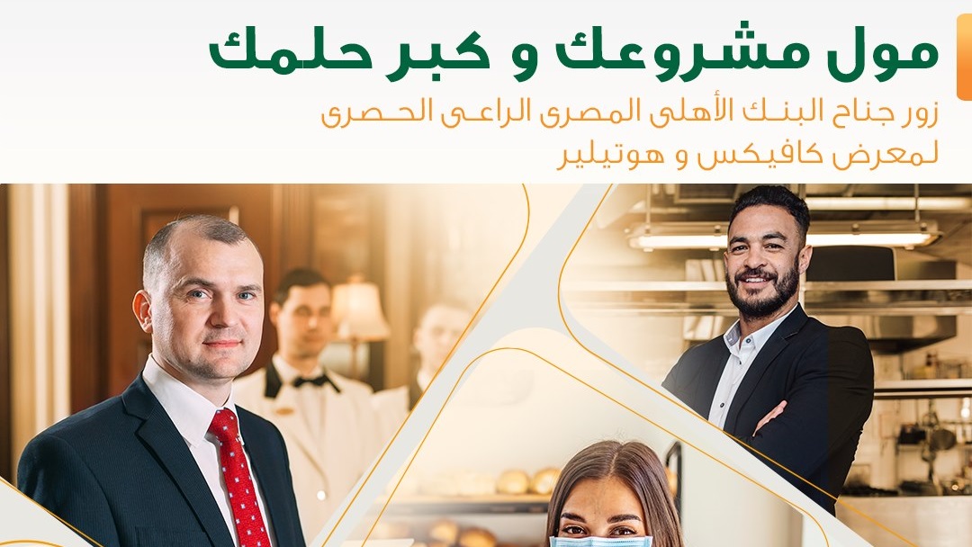 ولاكتشاف فرص تمويل مشروعك من البنك الأهلي المصرى، يُرجى زيارة البنك في جناح الستريت فوود في معرض كافيكس وهوتيلير من 1 إلى 3 إبريل، في مركز مصر للمعارض الدولية بالقاهرة الجديدة.