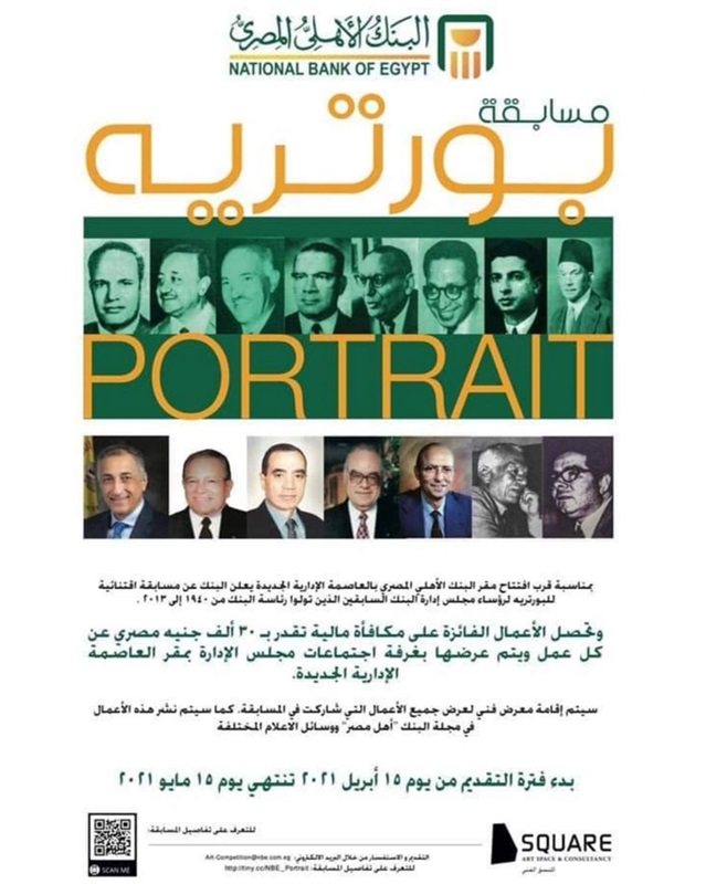 . بمناسبة قرب افتتاح مقر البنك الأهلي المصري بالعاصمة الإدارية الجديدة يعلن البنك عن مسابقة اقتنائية للبورتريه لرؤساء مجلس إدارة البنك السابقين الذين تولوا رئاسة البنك من 1940 إلى 2013.