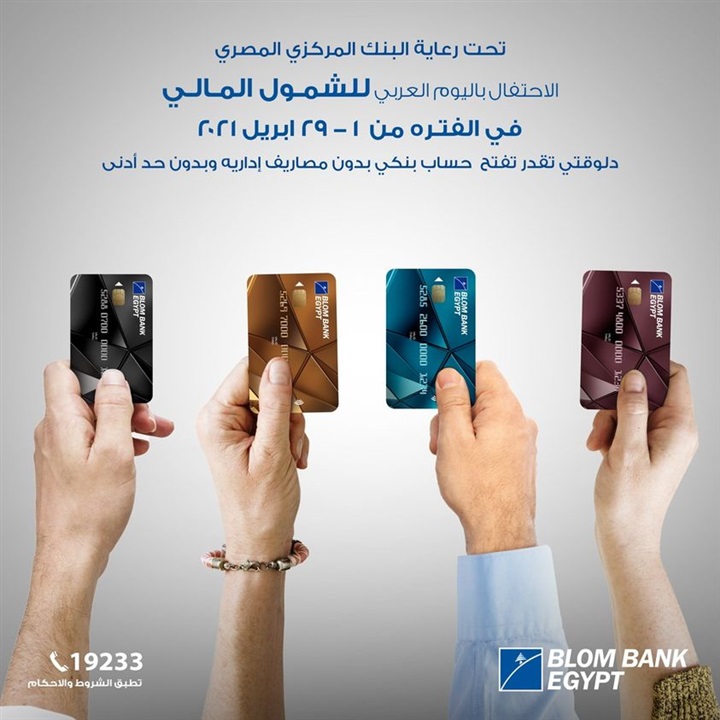 . بمناسبة الاحتفال بفعاليات اليوم العربي للشمول المالي برعاية البنك المركزي المصري، أعلن بنك بلوم- مصر، عبر صفحته الرسمية على موقع التواصل الاجتماعي “فيس بوك”، لعملائه عن إمكانية فتح حساب بنكي بدون مصاريف إدارية، وبدون حد أدنى لفتح الحساب، بالإضافة إلى الإشتراك في ” BLOM Wallet ” مجانًا.