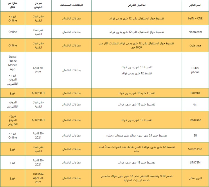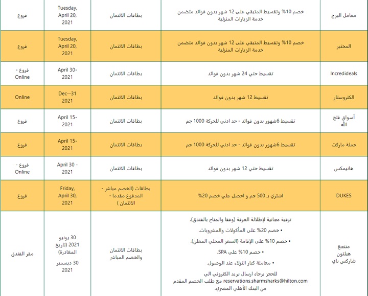 منتجات بنكية البنك الأهلي المصري يعلن عن عروض جديدة خلال أبريل بواسطة بنوك مصر 7 أبريل، 2021 كتب بنوك مصر 7 أبريل، 2021 النشر 0FacebookTwitterPinterestLinkedinWhatsappTelegramCopy LinkEmail 617FacebookTwitterPinterestLinkedinWhatsappTelegramCopy LinkEmail .أعلن البنك الأهلي المصري، عبر صفحته الرسمية على موقع التواصل الاجتماعي “فيس بوك”، لعملائه حاملي بطاقات البنك عن أحدث عروضه لشهر أبريل، حيث يقدم العديد من الخصومات وخطط التقسيط لدى مجموعة من الماركات والمتاجر.اقرأ أيضًا: قسط مشترياتك على 3 أشهر بدون فوائد ببطاقات البنك الأهلي الائتمانيةولمعرفة تفاصيل أكثر اضغط هنا. النشر 0 FacebookTwitterPinterestLinkedinWhatsappTelegramCopy LinkEmail بنك المشرق يعلن عن حاجته إلى موظفين جُدد انخفاض جماعي في مؤشرات البورصة بختام تداولات الأربعاء